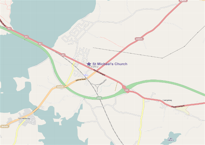 Follow the A55 all the way across North Wales and onto the island in the direction of Holyhead. Leave at the exit for Valley on the A5 and at the end of the slip road turn right on the roundabout. Cross the next roundabout following the signs for Valley. Continue straight on at the traffic lights. The church is on your right after 200 yards.