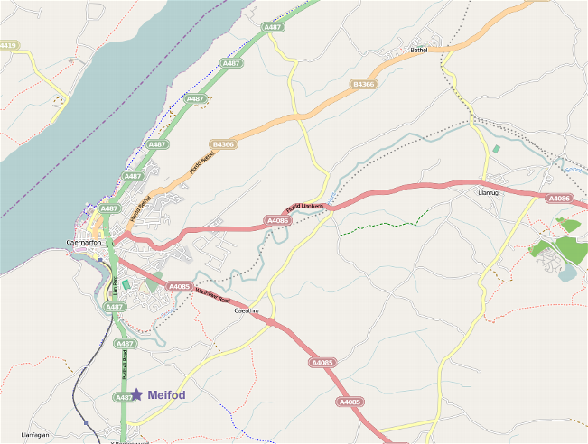 Take the A55 back towards Bangor. Once you cross the bridge back to the mainland take the A487 towards Caernarfon. Follow this road through the town and follow signs for the A487 towards Porthmadog. The venue is around 2 miles south of Caernarfon on the left hand side.